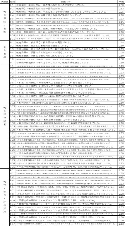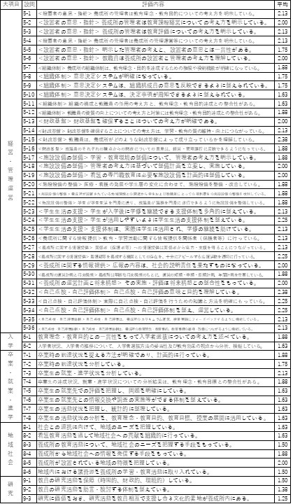 評価点が低いのは、教育理念、目的とカリキュラムや教育方法の一貫性に疑問があることがうかがえる。